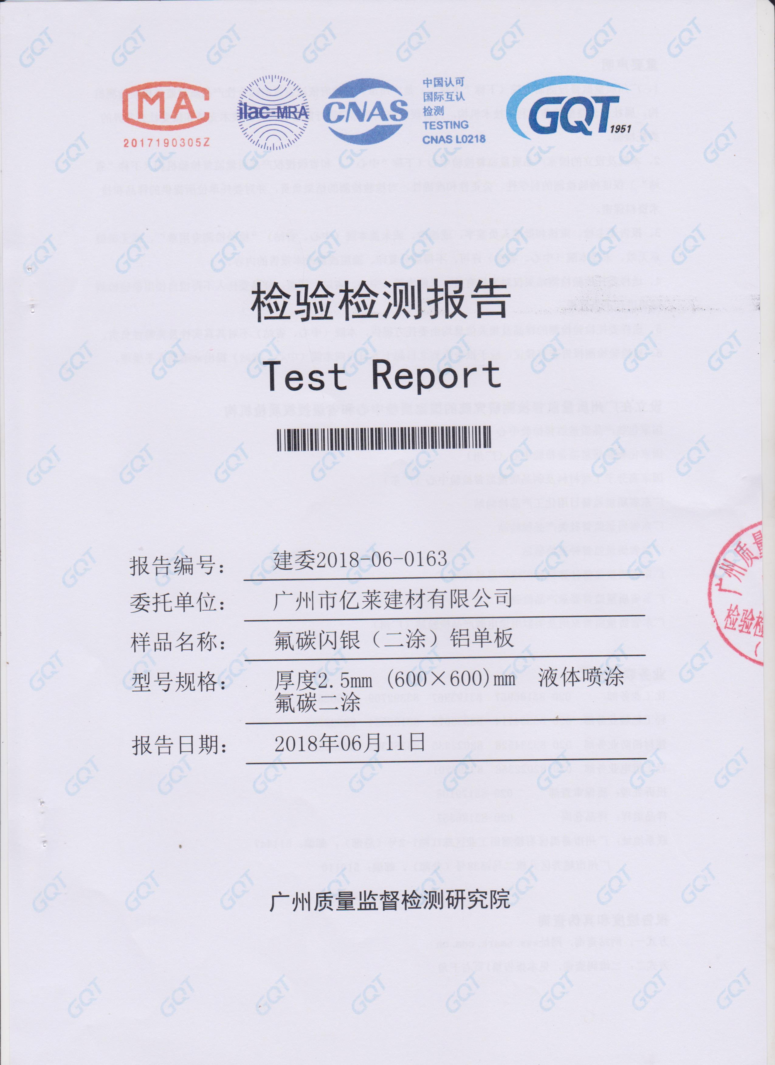 氟碳閃銀鋁單板檢測報告