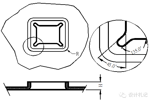 4.9 方形抽孔 方形抽孔,當抽孔高度較高時(H>Hmax),直邊部展開與彎曲一致, 圓角處展開按保留抽高為H=Hmax的大小套彎曲公式展開,連接處用45度線及圓角均勻過渡, 當抽孔高度不高時(H≦Hmax)直邊部展開與彎曲一致,圓角處展開保留與直邊一樣的偏移值. 以下Hmax取值原則供參考. 當R≧4MM時: 材料厚度T=1.2~1.4取Hmax =4T 材料厚度T=0.8~1.0取Hmax =5T 材料厚度T=0.7~0.8取Hmax =6T 材料厚度T≦0.6取Hmax =8T 當R<4MM時,請示上級. |